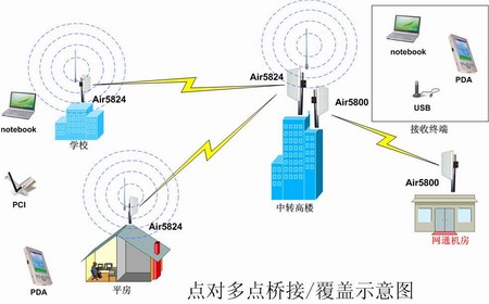 從上圖可以看出,我們需要在附近的最高點做為網(wǎng)絡(luò)的發(fā)射基地,由于最高點本身沒有網(wǎng)絡(luò)可以到,因此,需要在2KM外(網(wǎng)通機房)的地方,把網(wǎng)絡(luò)信號傳輸過來,使用的設(shè)備為我公司的Air5800設(shè)備,該設(shè)備工作在5.8G頻段,帶寬為54M。高樓橋接到網(wǎng)絡(luò)后,再通過Air5824雙頻無線網(wǎng)橋,傳輸?shù)脚赃叺慕ㄖ?,實現(xiàn)就地覆蓋,同時在高樓上面再做相應(yīng)的覆蓋,Air5824系列網(wǎng)橋為雙射頻輸出,一路為5.8G,一路為2.4G,其中2.4G輸出為1W的發(fā)射功率,可以實現(xiàn)室外無阻擋半徑1000米覆蓋。系統(tǒng)網(wǎng)絡(luò)建成后,目前發(fā)展用戶已達80多戶,為用戶解決網(wǎng)絡(luò)帶寬的同時,獲取了較高的利潤。更詳細的信息,請來電咨詢大宏科技公司。