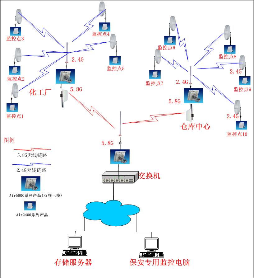 無(wú)線(xiàn)監(jiān)控應(yīng)用--臺(tái)山某化工廠(chǎng),為響應(yīng)國(guó)家安全生產(chǎn)的號(hào)召,結(jié)合公司的實(shí)際情況,決定對(duì)工廠(chǎng)的車(chē)間及倉(cāng)庫(kù)實(shí)施監(jiān)控,以便早發(fā)現(xiàn)問(wèn)題,早解決問(wèn)題。通過(guò)對(duì)工廠(chǎng)的實(shí)際考察,內(nèi)部已經(jīng)不允許拉線(xiàn)纜,因此工廠(chǎng)方面決定實(shí)施無(wú)線(xiàn)監(jiān)控。該項(xiàng)目一期工程共10個(gè)攝像頭,分別在倉(cāng)庫(kù)及車(chē)間,該10個(gè)攝像頭均采用球型網(wǎng)絡(luò)攝像機(jī)。具有18倍光學(xué)變焦,通過(guò)測(cè)試,完全符合工廠(chǎng)需求,在無(wú)線(xiàn)方面,為節(jié)省成本及避免干擾,采用2.4G和5.8G混合使用,其中5.8G鏈路負(fù)責(zé)主干傳輸,2.4G負(fù)責(zé)和各個(gè)監(jiān)控點(diǎn)傳輸。