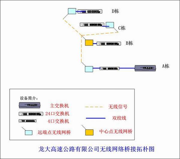 深圳龍大高速公路有限公司管理區(qū),有辦公樓一棟,標(biāo)為A棟,宿舍樓三棟,分別標(biāo)為B、C、D棟B、C、D分別與A棟實(shí)現(xiàn)無(wú)線橋接。拓?fù)鋱D如下: