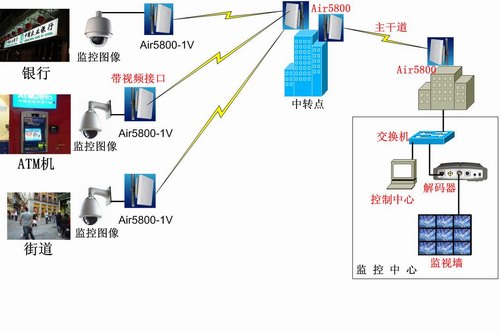 在本系統(tǒng)中,無線網(wǎng)絡(luò)設(shè)備全部采用大宏科技的Airwide無線網(wǎng)絡(luò)產(chǎn)品以點對點、點對多點的無線聯(lián)接方式,聯(lián)接70個監(jiān)控點,前端每個攝像頭配置一臺Air5800-1V無線網(wǎng)橋,該網(wǎng)橋內(nèi)置網(wǎng)絡(luò)視頻服務(wù)器,接收點用Air5800設(shè)備接收,整個系統(tǒng)采用5.8G的頻率設(shè)備。構(gòu)成以派出所為監(jiān)控中心的寬帶無線網(wǎng)絡(luò)。Air5800-1V采用先進(jìn)的MPEG4硬件壓縮技術(shù),對每個監(jiān)控點以1-2M速率,在網(wǎng)絡(luò)上以30幀/每秒傳輸高質(zhì)量的實時視頻圖像,終端以硬件解壓,通過矩陣上電視幕墻。